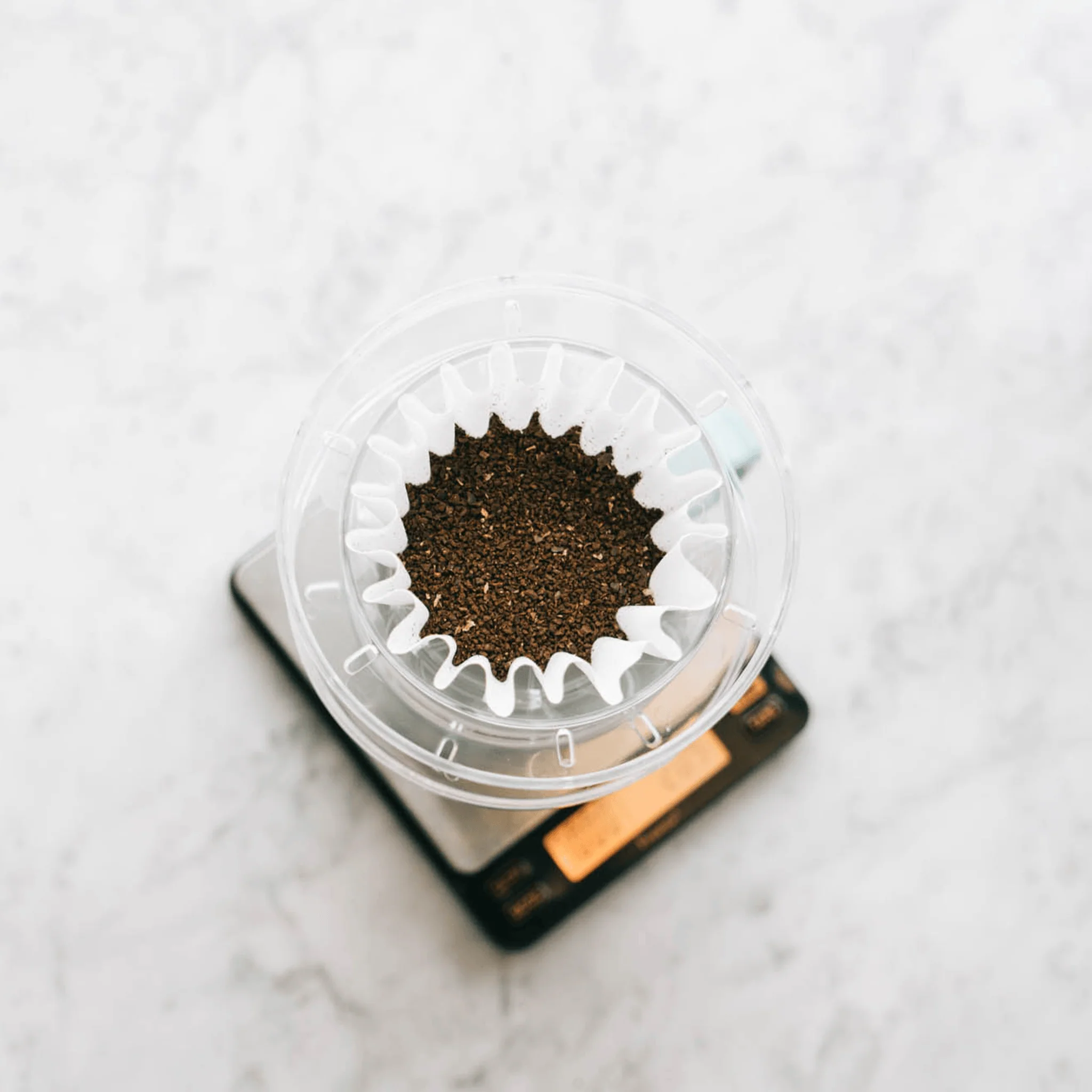 - Place Gabi + decanter onto the scale. Add 16g ground coffee into the filter.
